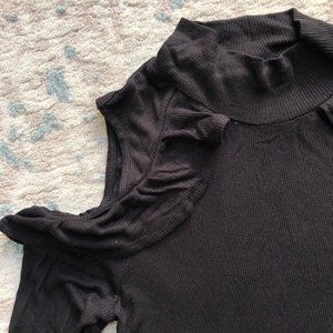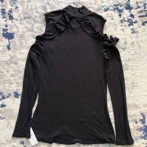 Casual mock neck top. Cold-shoulder style. Ruffles around shoulders. Ribbed throughout.