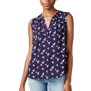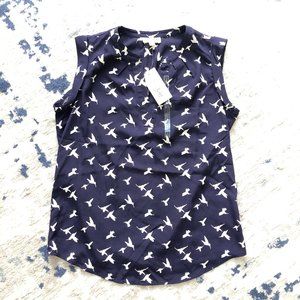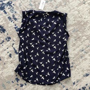 Two-tone casual top. Pullover style with split neckline. Bird print throughout. Sleeveless.