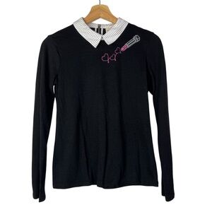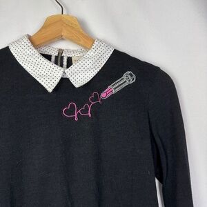 Maison Jules Black White Collar Lipstick Heart Long Sleeve Top XS