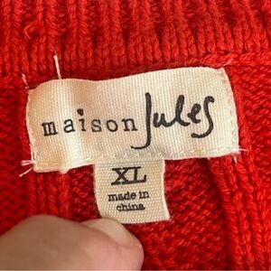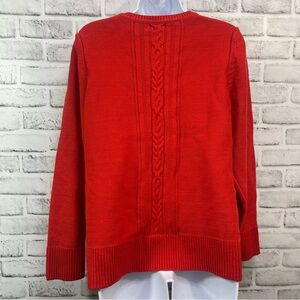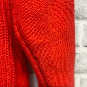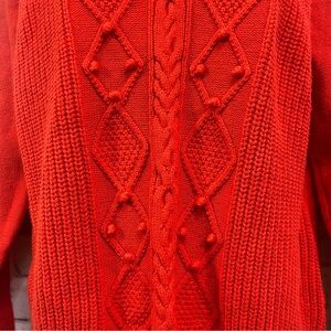 Red, textured front, knit balls, cable front, small snag and stain on sleeve see picture, colors may vary due to lighting, good used condition, XL