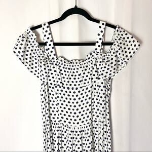 Excellent used condition! Off white and navy blue polka dot midi dress with a dainty cold shoulder flutter sleeve. Square neck with tiered ruffled all the way down. A great casual wedding guest dress, baby shower, bridal shower or special occasion.