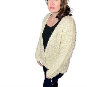 Maison Jules cream and gold metallic eyelash open cardigan. Long sleeve. 55% polyester 36% acrylic 6% nylon 3% metallic. Dry clean. Size large