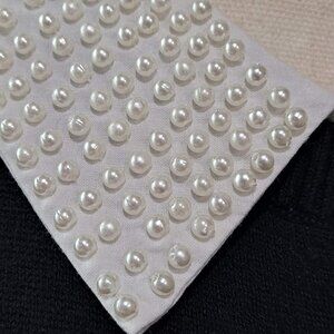 Soft and flattering thin black sweater has mesh sleeves and a white peter pan collar covered in pearls. Hook and eye closure above keyhole at the back of the neck (it does close, it just was not able to do so on the mannequin). There are no signs of wear or damage.