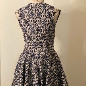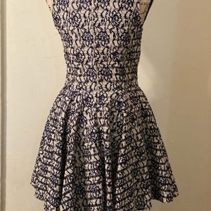 A high-volume circle skirt takes center stage on Maison Jules' flared dress finished with an allover blue floral lace overlay. Crew neckline. Hidden zipper with hook-and-eye closure at center back. Sleeveless. Allover lace overlay. Super flattering fit-and-flare silhouette. Lined. Hits mid-thigh. Fabric Content: Polyester/cotton; lining: polyester. Perfect for date nights and special occasions.