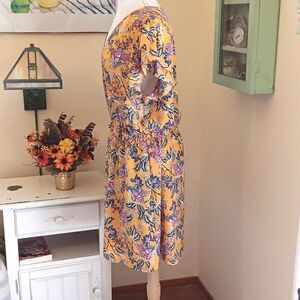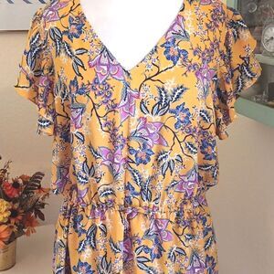 contrast design. V neck , fluttery sleeves, drawstring at waist. Skirt is lined. Size XXL measures 48 at chest, 38-44 at waist, 50 at hips, pockets here. 39 long from shoulder to hem. Sunny and fun!