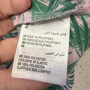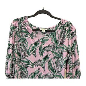 Maison Jules Womens Pink Green Palm Print Blouse 1X 3/4 Sleeves Smocked Details