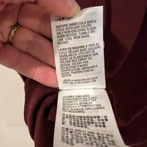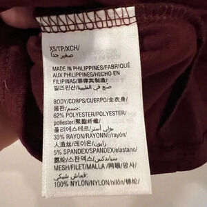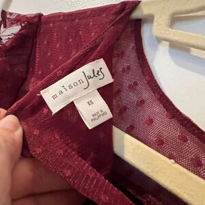 This Maison Jules women’s shirt has sheer Swiss lace and ruffled trim. The back of the top has a keyhole cut out and velvet ribbon tie. The color is burgundy and it’s a size xs. This is a cute feminine top. The top is in good condition with no stains or snags and comes from a smoke free home.