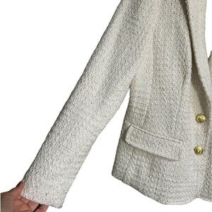 Great looking off white Boucle blazer with gold metallic threads running through. 2 brass anchor themed button closure, 3 brass button accents on sleeves, back vent, slash chest pocket, 2 flap front pockets.
