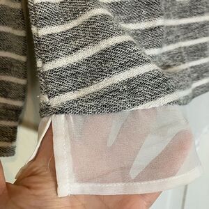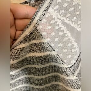 This Maison Jules, gray and white shirt, has a lot of different details -lace at the shoulders, sheer white detail at the bottom. It is an excellent condition and a women’s size small.