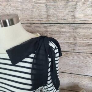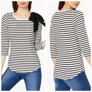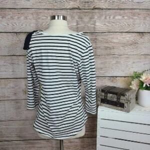 Maison Jules Striped Bow Detail Top. A large contrasting bow adds the perfect pop of fun and personality to this Maison Jules top with 3/4-sleeves and a striped print. Crew neckline. Bow embellishment at shoulder. 3/4-sleeves. Size Large. Excellent Used Condition. 95% Cotton, 5% Spandex.