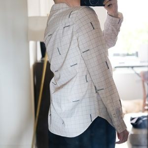 Maison Kitsuné crosshatched button down with "Maison Kitsuné" embroidered all over the shirt. Please note there is some faint discoloration on the right lapel near the bottom, see last photo for reference. Beautiful formal wear from Paris, size 40, 100% cotton.