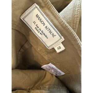 Maison Kitsune Paris Utility Military Mini Skirt Olive Green Gold Button Detail, size 40 or approximately a M/L. Good preowned condition, Cotton Blend. This skirt exudes a military vibe perfect for casual spring and summer days or nights. Logo Zipper detail and front and back pockets