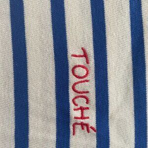 NWT off white tee with blue stripe and Touch emrbroidery. Size vents at hem.