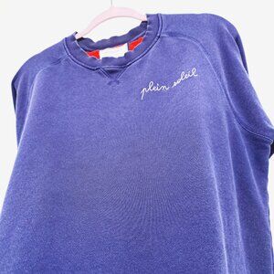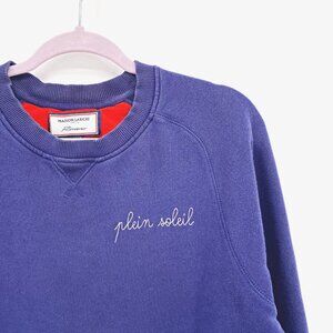 Blue crew neck unisex sweatshirt with "plein soleil" script embroidered at the chest. Ribbed edges. Medium weight. Raglan sleeves. 100% cotton. Made in Portugal. Size large