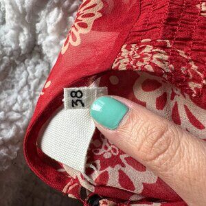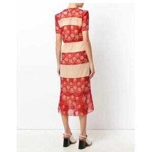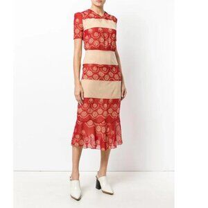 French fashion house Maison Margiela was originally founded in 1988 by the elusive Belgian designer Martin Margiela. Currently helmed by British designer John Galliano, the label plays with themes of deconstructionism and reinterpretation. The brand fuses a grunge-twist of asymmetric detailing with an unconventional elegance to everyday essential pieces. This red and beige floral embroidered midi dress is a vibrant yet elegant piece from the AW17 collection and features a round neck, short sleeves, a mid-length, a frill trim, an embroidered floral design and a panelled colour block design.