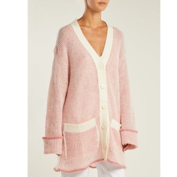 Description: This super lightweight and comfy pink cardigan is from MM6 Maison Margiela. It is made of 32% Acrylic, 24% Mohair, 24% Polyamide and 20% Polyster. It has a loose fit and features white trim and buttons, pink throughout the hems and two front pockets. It is super warm and easy to thrown on in the fall.