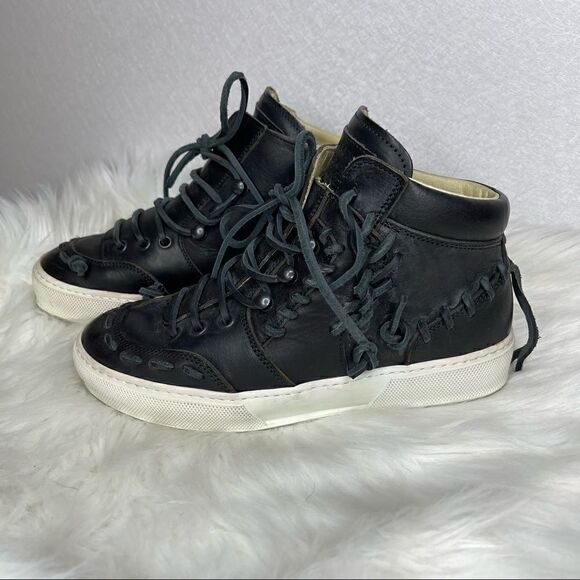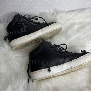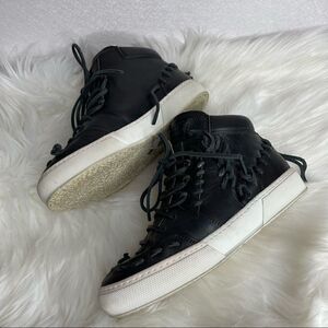 •Features: Black lace up high top sneakers. Lace detail throughout.