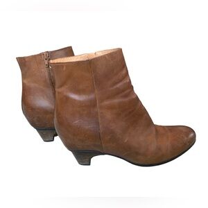 Martin Margiela brown leather ankle booties with a hidden wedge inside heel and outside wooden stacked kitten heel.