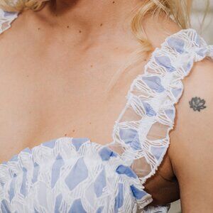 From the La Belle Revolt collection (2020), the Maude top is crafted in sheer embroidered tulle with abstract rectangular patterns in soft black, blue, and lilac tones over an ivory base. Features pre-shaped pleated cups, vertical boning for structure, and adjustable gathered straps. Finished with a triple-row hook closure at the back for a customizable fit.