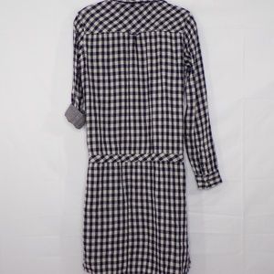 Maison Scotch Gingham Tie Waist Shirt Dress Sz 2, drop waist, sleeves can be worn long or rolled up, snap buttons, contrasting lining, leather waist tie, large front pockets,