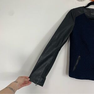 - Navy blue color wool jacket with black leather sleeves