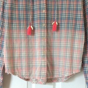 This super cute top features buttons up the front, a collar, a tie detail at the neck with hot pink tassels and seashells, and long sleeves with buttoned cuffs. It also has a curved hem with a tattered edge and a pleated upper back. There is a small brand charm on the left hip. It has a boyfriend fit, making it relaxed and loose. It has a faded ombre pastel blue, pink, yellow and white colored plaid! It is comfortable, thin and lightweight, making it perfect for Spring and Summer. Such a cute piece to pair with jeans, could also layer with camisoles. Classic, simple and casual. A must have for any wardrobe! High quality!