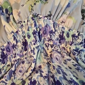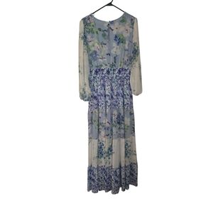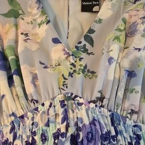 This elegant sundress by Maison Tara features a romantic watercolor floral print in shades of blue and purple. Designed with a v-neckline and bishop sleeves, it offers a flowing silhouette perfect for a wedding guest or resort wear. The notched collar and gathered waistline add a touch of sophistication to this comfortable and stylish dress.