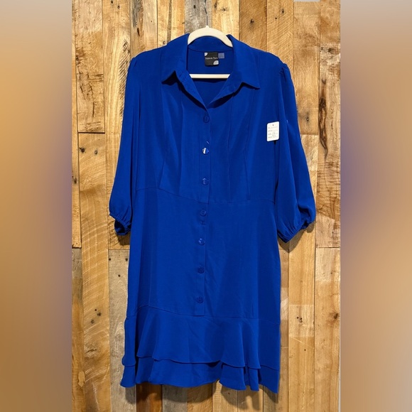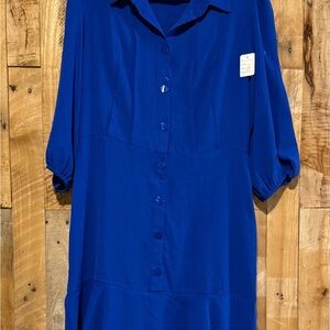 Elegant button-down dress with a classic collar. Features three-quarter sleeves. Perfect for any occasion.