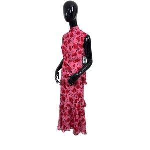 Maison Tara Women’s Primrose/Red Floral Mock Neck Tea-Length Dress 12, 14, 16