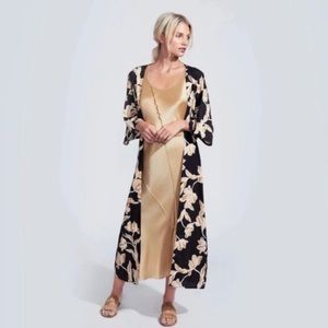 Kimono chic! Maison Du Soir robe. Golden floral print on black. Tie sash at waist. Ankle length. Can be worn from the bedroom to brunch! NWOT, washed but never worn.