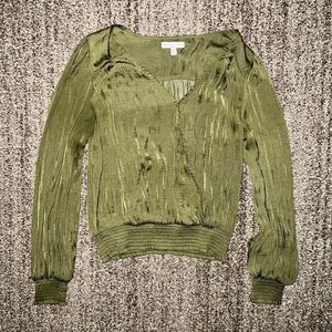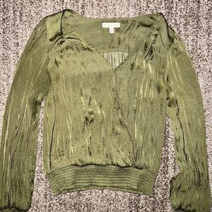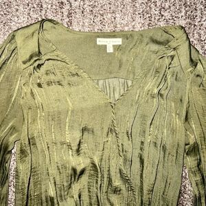 Color is olive green, material is super soft and silky, v neck cut, loose fit, full length sleeves
