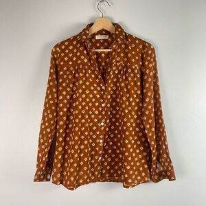 Maison Hotel blouse featuring the "Bandhani Spring" print. This print is a tie-dye replica, and the blouse is made from hand-printed cotton voile. The blouse has a full button-up design and a relaxed fit.