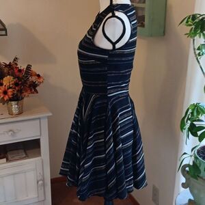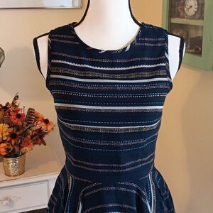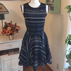 Ready for any occasion, this fit and flare dress. Seaming detail, back zip, fully lined Iined. Size XS measures 34 at chest, 26 at waist, full skirt. 34 long from shoulder to hem. A beautiful statement.