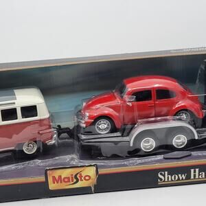 Maisto Road & Track Die Cast Red Volkswagen Van Samba with VW Beetle New sealed. Show Haulers series. Van 1:25, Beetle 1:24.