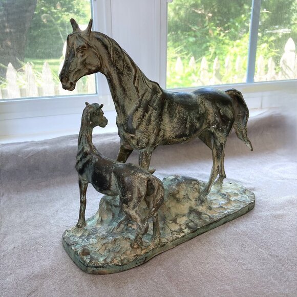 Elegant Maitland-Smith bronze sculpture depicting a horse with a foal, beautifully detailed and finished with a green patina that enhances its timeless look. This piece is crafted from cast metal, possibly brass, and showcases Maitland-Smith’s signature quality and artistry. The patina was applied; on the underside, the metal color is gold/brass. The metal color makes me assume that it may be made of brass.