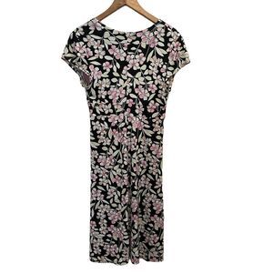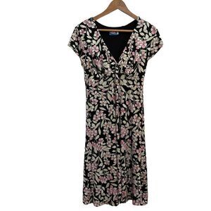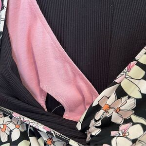 Majamas Floral V Neck Maternity Nursing Dress, black with cream and pink flowers, lined with nursing access under the V, excellent pre-owned condition.