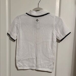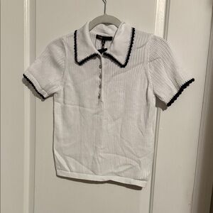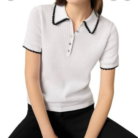 Elevate your style with this chic white ribbed polo top featuring elegant black trim. Perfect for any occasion, this top combines comfort and sophistication. By 1