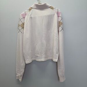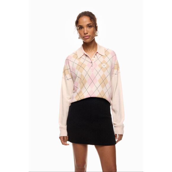 This Maje sweater offers a preppy vibe with its pastel argyle pattern and delicate collar detail. Ideal for a smart-casual look, pair it with a solid mini skirt and loafers for a touch of classic charm.