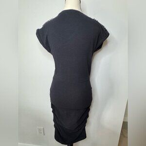 Chic meets comfort in this stunning Maje t-shirt dress. Features sparkling crystal-embellished shoulders that add a subtle edge, and flattering ruching along the sides for a smooth, body-hugging silhouette.