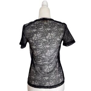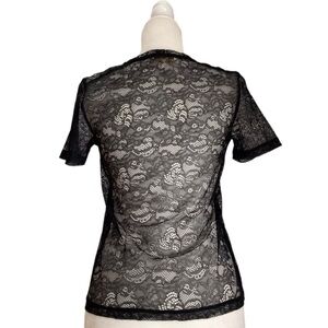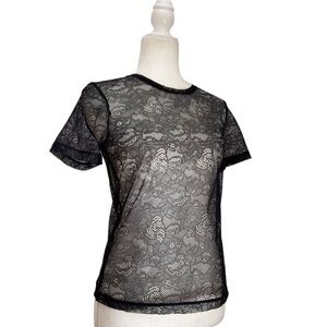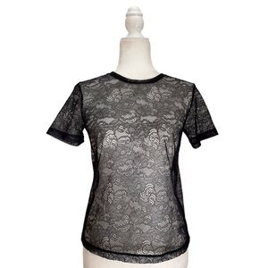 Beautiful Maje Black Lace Pattern Sheer Crew Neck Top featuring short Sleeves and semi fitted silhouette