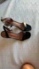 Stylish black and tan sandals featuring a chic gold chain detail. Perfect for any occasion.