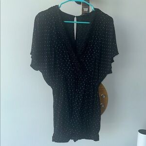 Chic Maje black romper with white polka dots. Features a deep V-neck and short sleeves.