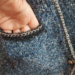 Button holes, collar, hem and four patch pockets embellished with fine silver-tone chains