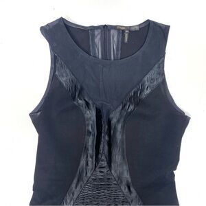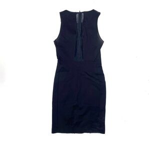 Black sleeveless Bodycon dress, mesh neckline and back panel. Back zip.