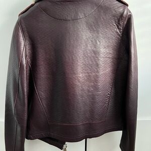 Stylish Maje leather jacket in burgundy with a cream collar. Features multiple zippered pockets for a chic look.
