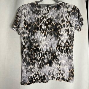 Maje Cheetah Print Linen V Neck T Shirt. White, black and brown cheetah print. V neck, cap sleeve tshirt. Lightweight and 100% linen. Size 1 (equates to a size Small).