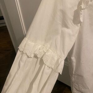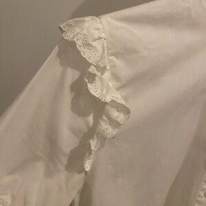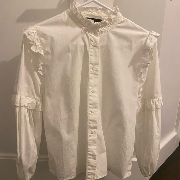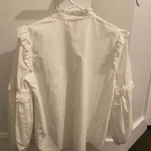 Chic cream blouse with delicate ruffles. Features button-up front.