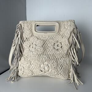 The Maje Crochet Knit M Bag is a bohemian-inspired accessory featuring openwork crochet with floral motifs, fringe detailing, and a sheathed leather handle. It includes an adjustable, removable strap for versatile styling options: carry it by hand, over the shoulder, or crossbody. Materials and Measurements Crossbody bag with embroidery and magnetic button closure. Open pockets. Removable crossbody strap. Dimensions: 8" x 9" x 3". Imported.
