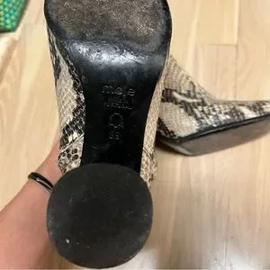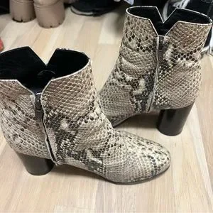 Maje embossed python booties that look stylish and go with every outfit during cooler temperatures. Come in FR 39 (I’m a US8). So comfortable to walk around the city with these ankle boots despite the heel height of about 8cm. Made out of embossed python and a brown black wood heel.