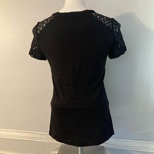 Soft black material with beautiful lace inset detail at sleeves, across top and into a V in the front
